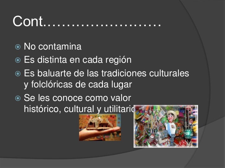 - 2. Cont.…………………… No contamina Es distinta en cada región Es baluarte de las tradiciones culturales y folclóricas de cada lugar Se les conoce como valor histórico, cultural y utilitario
